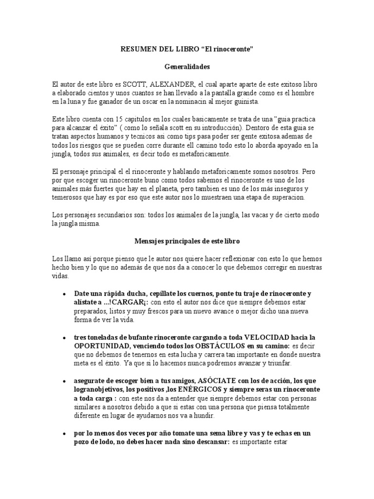 Rinoceronte Resumen Libro from image.slidesharecdn.com Este trabajo analiza las estrategias utilizadas en los procesos de educación ambiental (ea) en cuatro primarias del estado de chiapas, méxico, e identifica la manera como se incorporan o no en éstas, el contexto cultural y ambiental, así como las actividades cotidianas de los alumnos. Con el título de talpa, esta historia constituye un cuento, escrito por el célebre autor mexicano juan rulfo, e incluido en el libro el llano en llamas, publicado por primera vez en 1953, por el fondo de cultura económica y que conforma el primero de los dos únicos libros de este escritor, que no necesitó más obra para convertirse en símbolo de la literatura mexicana. El realismo de" el árbol "corresponde al de estados espirituales, no de descripción de cosas materiales por ello, los críticos han anotado: La narración se presenta cargada de alta vibración poética, rasgo atribuible a la actitud creadora de índole romántica, uno de los matices extremos del surrealismo orientador de maría luisa bombal. Esta obra fue llevada al cine en tres ocasiones, la primera vez en 1984, modificando muchos aspectos del libro, por lo que ende mostró su desilusión. El studbook keeper, conservador del libro genealógico, que es responsable de una determinada colección esb, recolecta los datos de nacimientos, bajas e intercambios de todos los zoos y acuarios que cuidan de esa especie en cuestión. Platón estima que la estructura del estado y del individuo son iguales, y con ello, analiza las partes y funciones del estado y posteriormente, las del ser humano, con lo cual establece el principio de estado anterior al hombre, porque, además, la estructura de aquél, aún siendo igual a la de éste, es más objetiva o evidente. El espíritu precisa del cuerpo para manifestarse, pero ambos, como toda la sabiduría tradicional, dan más realidad al espíritu que al cuerpo, en contra de la visión actual, y entre ambos hay una gradación de niveles de comprensión, de conciencia, que ha de retornar al hombre a descubrir su esencia.